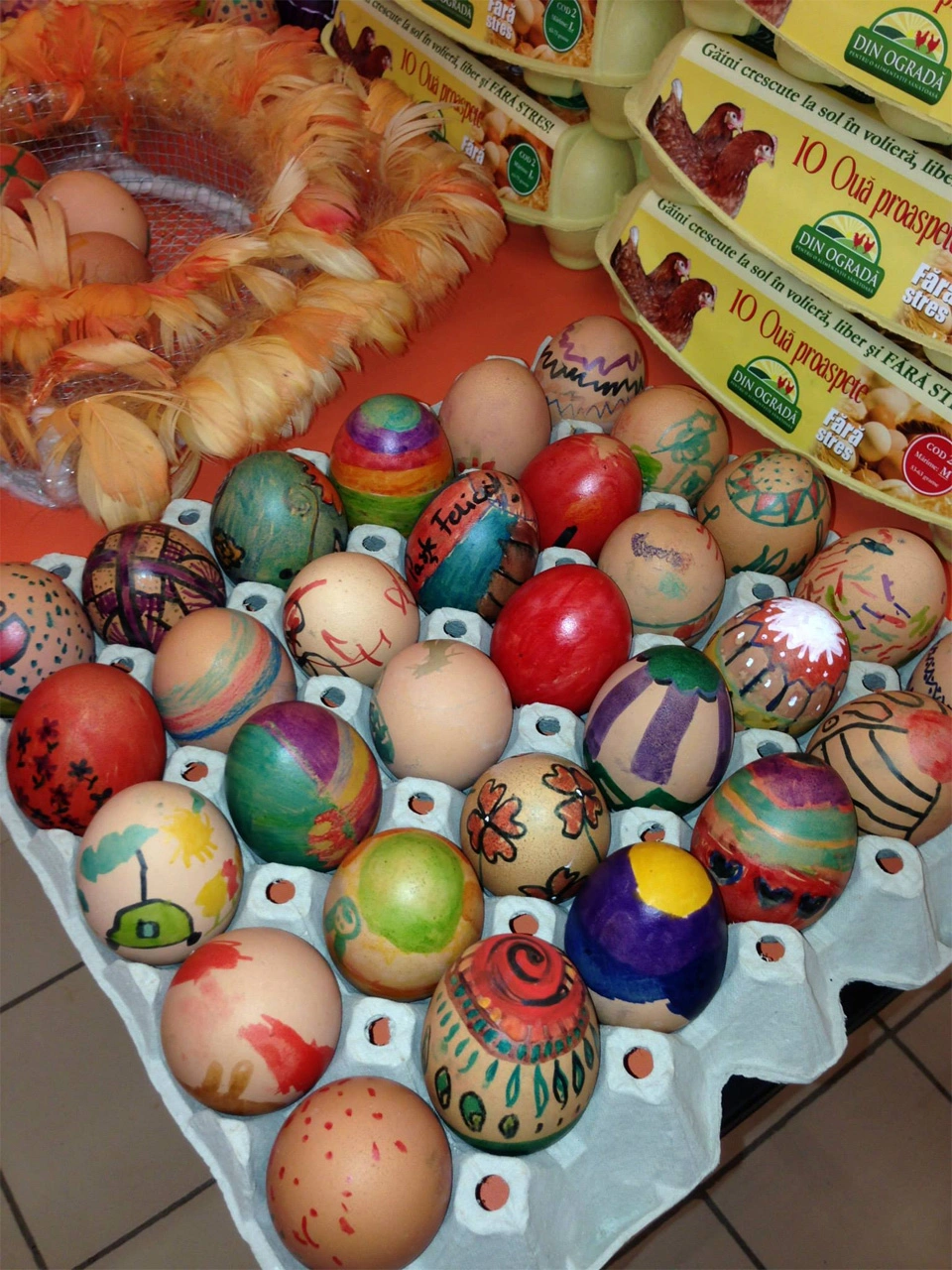 Copiii de toate vârstele, care au dorit sa încondeieze singuri un ou pentru Paște, au fost oaspeții ”atelierului” nostru. Creațiile micilor artiști le-am adunat și au constituit motivul felicitării noastre de Paște.
